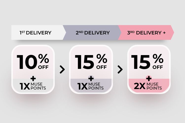 Get 10% off your first delivery (and 1x MUSE points). You’ll get 15% off your second delivery (and 1x MUSE points). From your 3rd delivery onwards, you receive 15% off AND double MUSE points with each future delivery.
