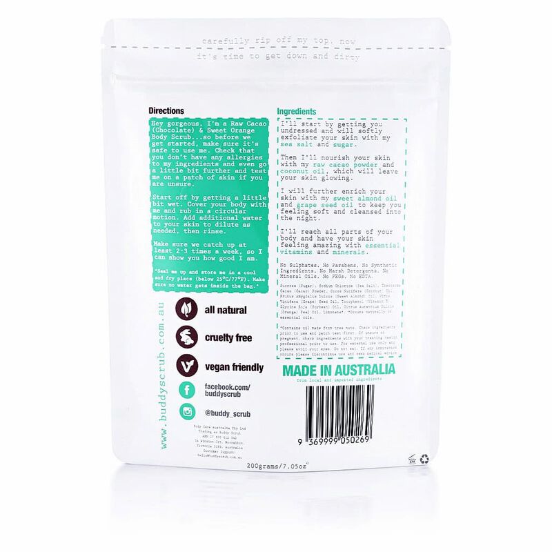 All natural, vegan friendly and cruelty free Exfoliate, nourish and moisturise your skin with superfoods and skin loving ingredientsOrganic, natural and quality sourced ingredients from around Australia & OverseasMade in Australia with loveNo Sulphates, No Parabens, No Synthetic Ingredients, No Harsh Detergents, No Mineral Oils, No PEGs, No EDTA.Smells like chocolate orange cake, yum!