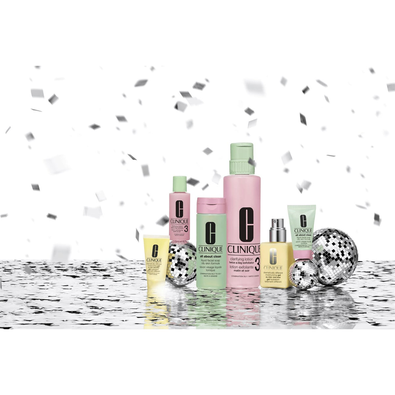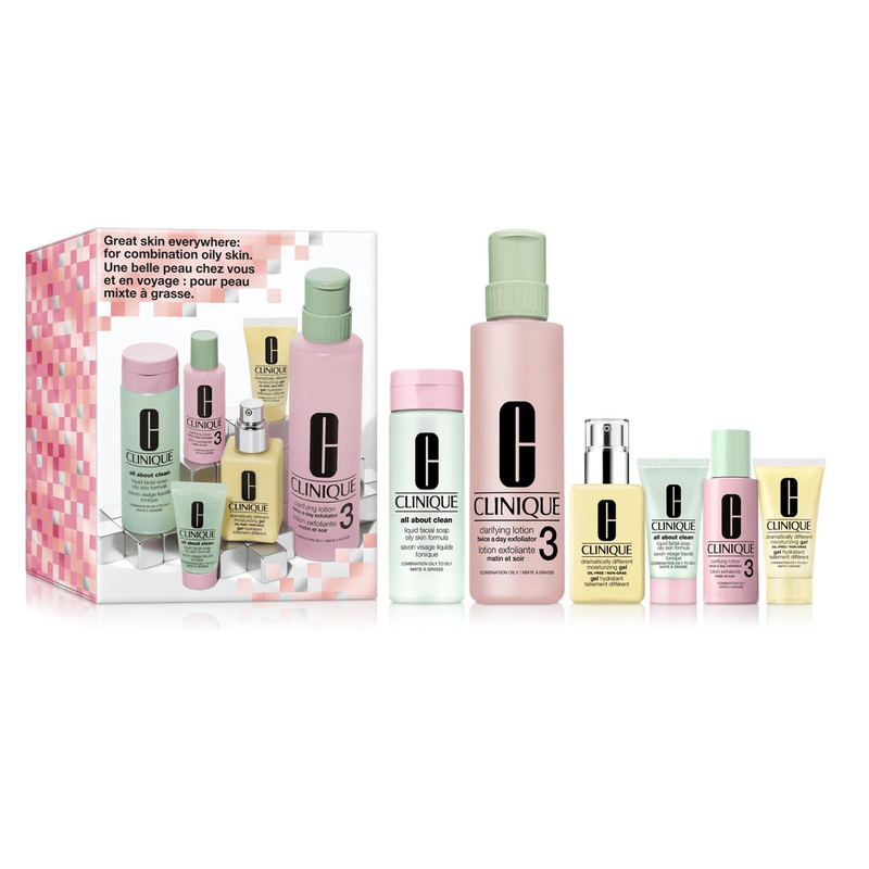 Clinique’s signature 3-Step System for healthy-looking skin—one set for home, one for travel. Customized for oilier skin types.