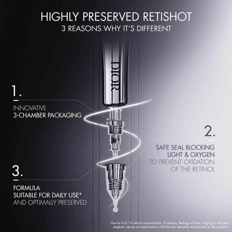 Capture Totale Retishot night concentrate is Dior's first intensive solution that corrects the appearance of 6 age-related skin quality issues: visible pores, a dull complexion, roughness, unevenness, imperfections and marks such as those caused by the sun or acne.Infused with [H.P.] Retinol – 0.1% concentrated pure retinol in the formula – and longoza extract, Capture Totale Retishot promotes skin renewal and refines skin texture. Day after day, skin quality is visibly improved and skin appears younger.Capture Totale Retishot is clinically shown to be effective, and has been validated by a panel of dermatologists who are experts in laser treatments.