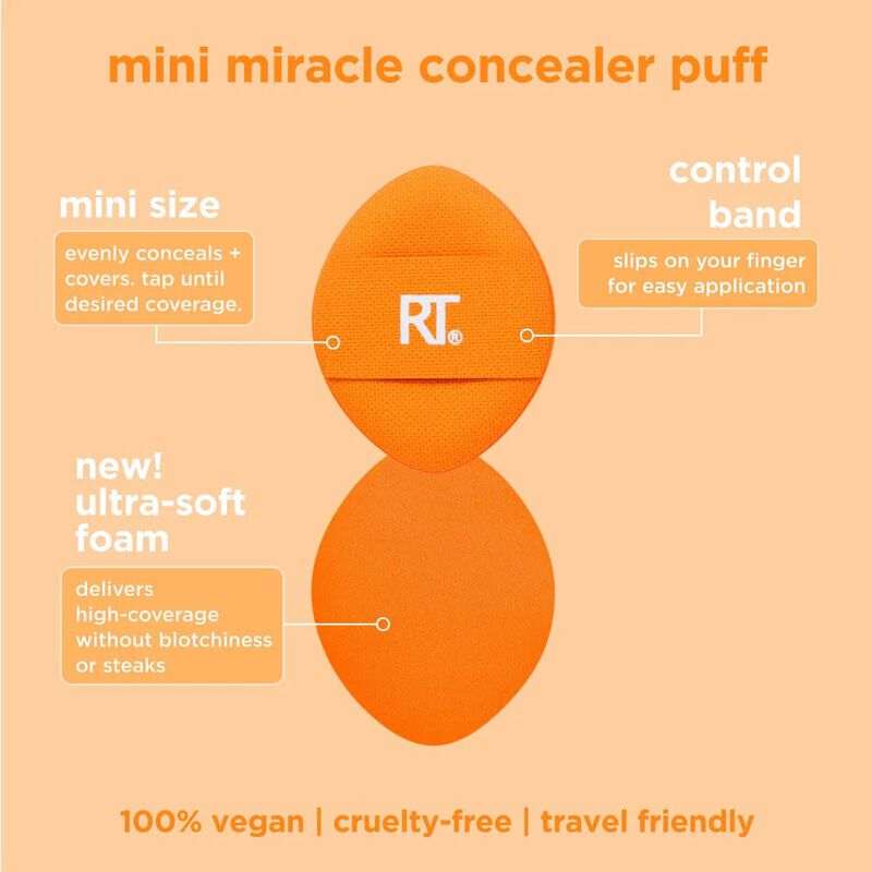 The Real Techniques Mini Miracle Concealer Puff Trio brings you 3 mini-sized puffs in a new ulta-soft sponge material for targeted concealing and covering. These extra small makeup puffs slip on your finger and are held in place with the control band for easy, precise application. The mini size fits into the contours of your face, so you can achieve maximum coverage by tapping liquid or cream concealer on any blemishes or imperfections. The best part. These mini puffs are made of a super dense material that reduces product absorption for less waste and more coverage. These concealer puffs are also perfect for taking on-the-go to touch-up throughout the day. It’s recommended to replace them every 30 days. As with all our RT products, these Mini Miracle Concealer Puffs are 100 percent vegan and cruelty-free.