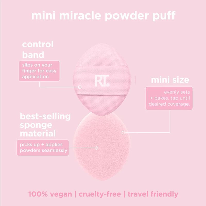 The Real Techniques Mini Miracle Powder Puff Trio brings you 3 mini-sized puffs designed with our best-selling powder sponge material for targeted setting and baking. These extra small makeup puffs slip onto your finger and are held in place with the control band for easy, precise application. Apply powder products under the eyes, around the nose, or anywhere you get oily for seamless setting or baking. Our best-selling powder sponge material is made with velvet fibers that pick up and apply powder for a blurred effect on the skin. These powder puffs are also perfect for taking on-the-go for touch-ups throughout the day. It is recommended to replace them every 30 days. As with all our RT products, these Mini Miracle Powder Puffs are 100 percent vegan and cruelty-free.