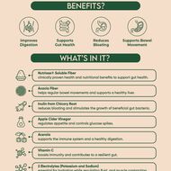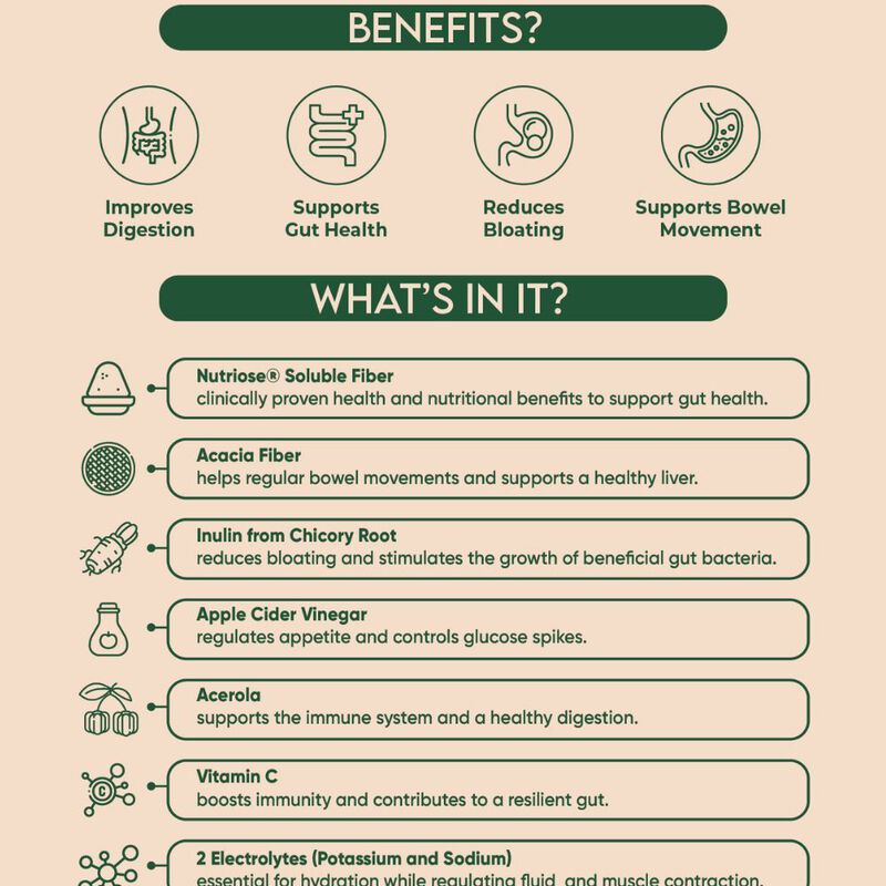 GUT HEALTH Prebiotic drink mix is made with a powerful blend of Fiber as known as NUTRIOSE® a patented soluble fiber, acacia and inulin fiber, apple cider Vinegar, Acerola and vitamin C: to improve digestion, reduce bloating and constipation, help feel lighter and more balanced, support gut health and control bllod sugar level.