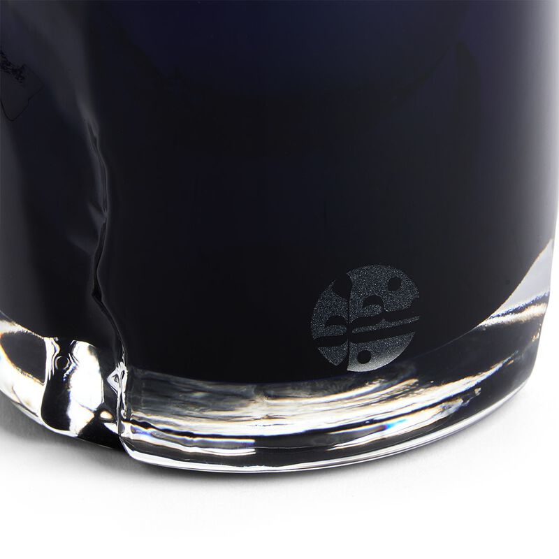 Material: Tinted dark blue glass vessel with removable silver metal insert, for ease of cleaning and filling.