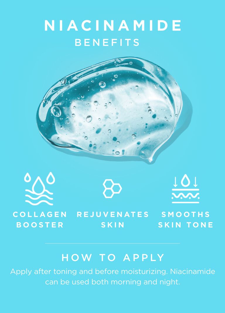 This ingredient is best for acne prone skin. Niacinamide can be used in the morning and evening, It is best applied after toning and before moisturizing. Avoid mixing with Vitamin C as it can minimize its effects